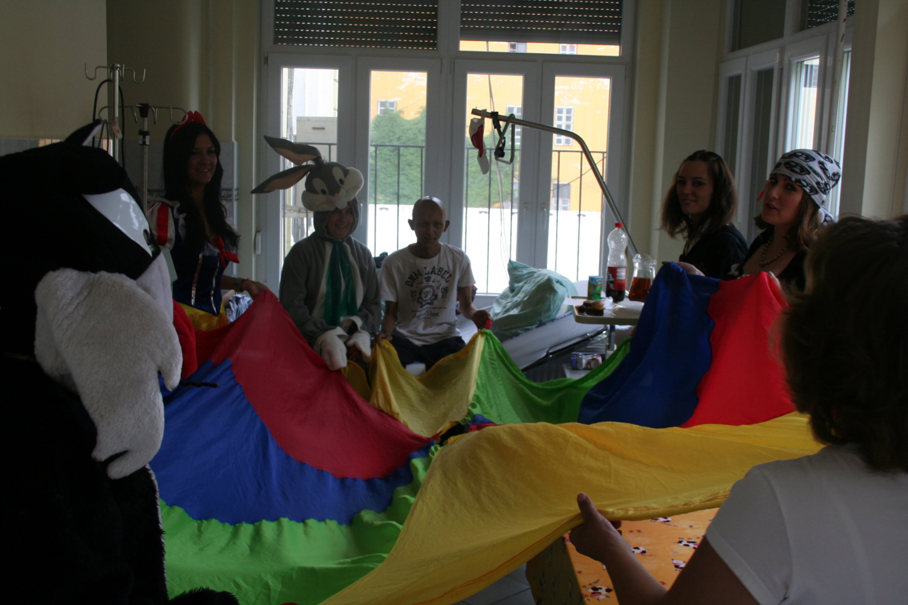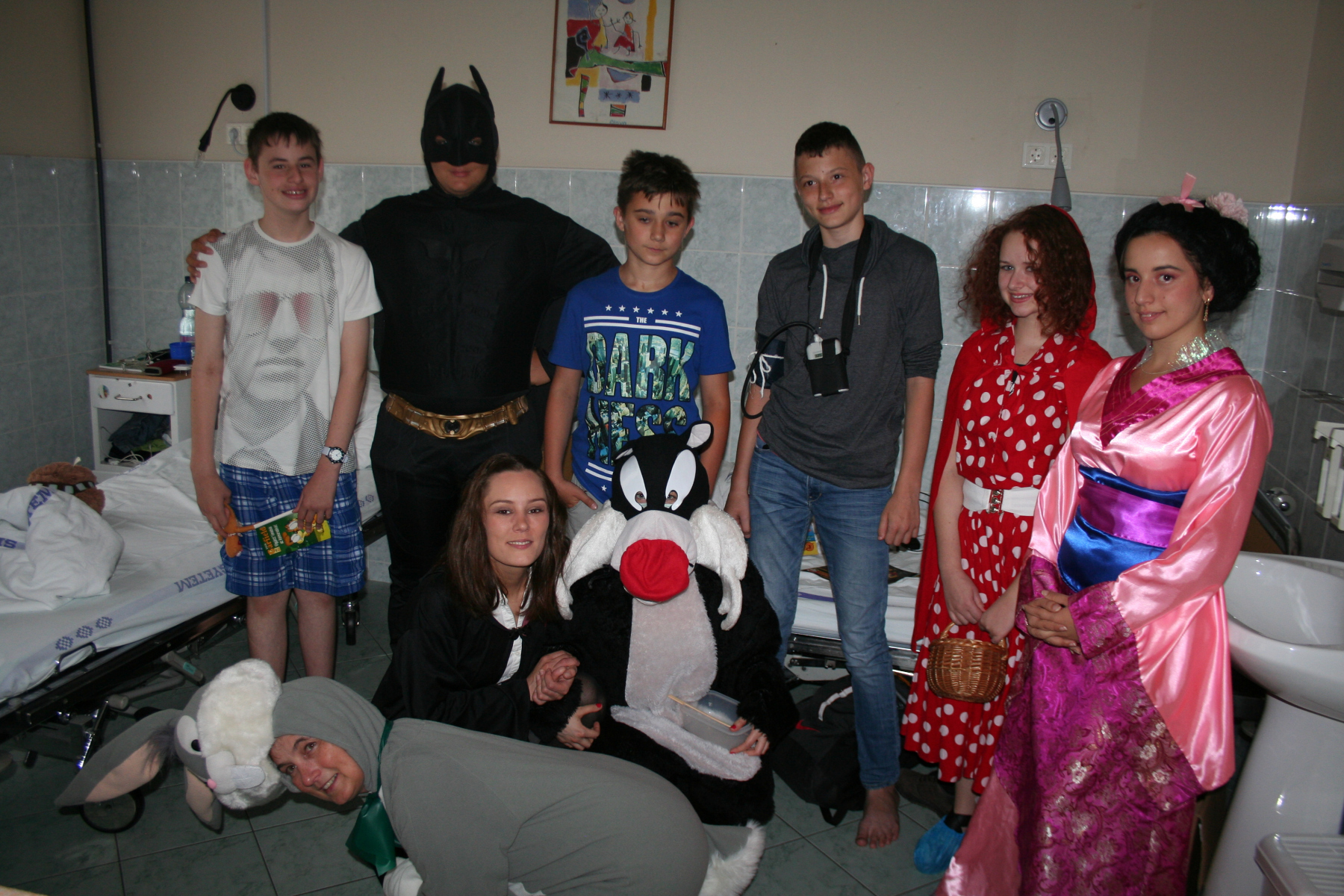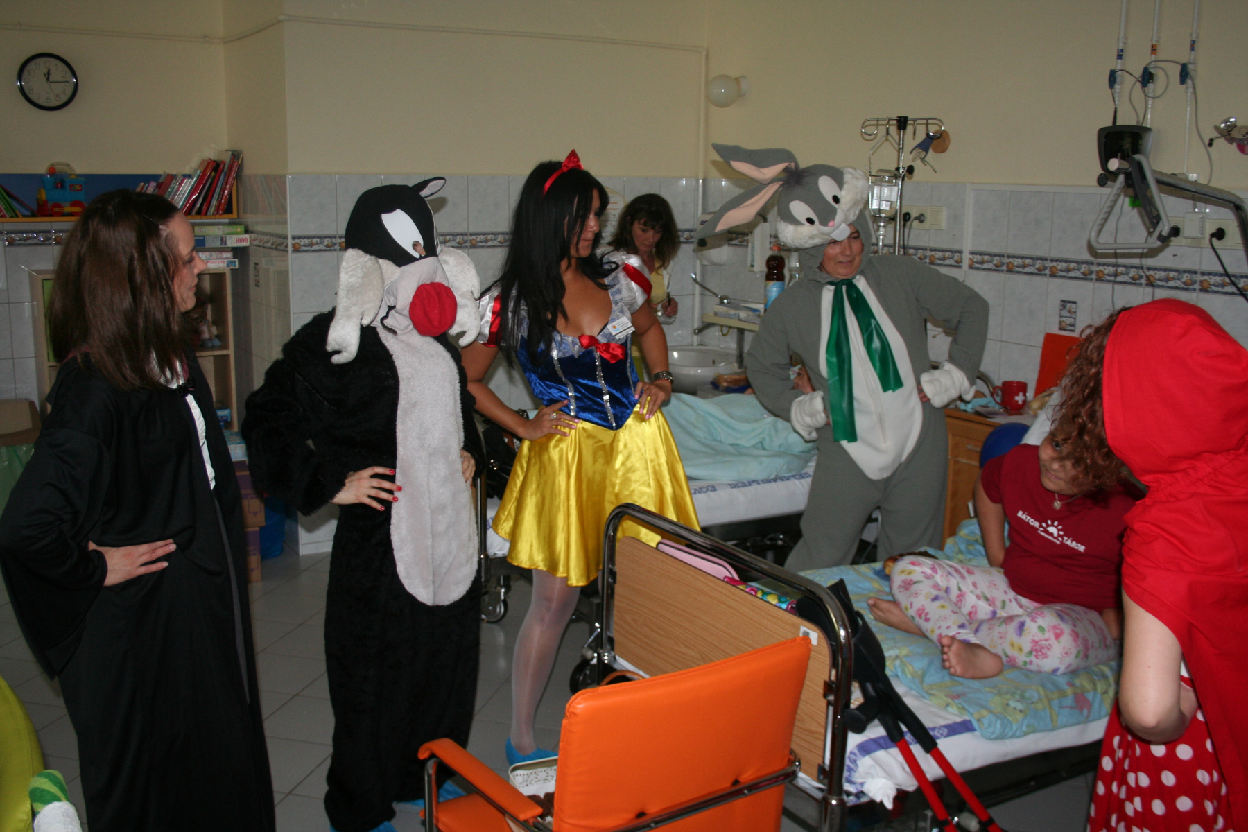 Alapítványunk meseszereplőknek öltözve látogatta meg a Tűzoltó utcai Gyermekklinikán kezelt gyermekeket, a tegnapi nap folyamán. Tapasztaltuk, hogy a játék, a pozitív, vidám élmények és a társaság nagyban elősegítik a gyermekek gyógyulását, ezért is döntöttünk úgy, hogy önkénteseinkkel karöltve, egy kis vidámságot viszünk a beteg gyermekek szürke hétköznapjaiba. A gyerkőcök nemcsak a jelmezeknek, de a játékoknak és az önkénteseink által készített süteményeknek is nagyon örültek. Külön öröm volt számunkra, hogy a gyermekek gyógyulását végző szakemberek és a kisbetegek mellett sokszor „24 órás szolgálatot” teljesítő édesanyák arcára is mosolyt varázsolhattunk néhány órára. Hálás köszönettel tartozunk a Maszka Jelmezkölcsönző és Készítő Kft-nek, akik Alapítványunk számára, térítésmentesen biztosították ezeket a fantasztikus jelmezeket.